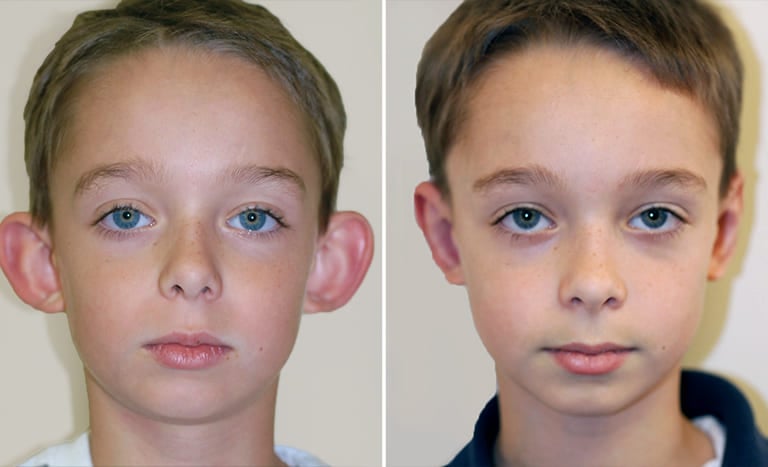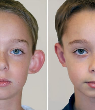 Résultat après otoplastie sur un jeune patient. Cette intervention permet de repositionner les oreilles de manière naturelle, améliorant l’harmonie du visage et la confiance en soi. Chaque cas est unique et traité avec attention, en respectant la croissance et la morphologie du patient.